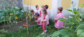Á volta das vacacións de verán imos á horta a recoller: tomates, cebolas, pementos e xudías.